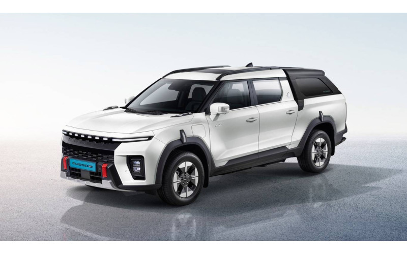 Дизайн Musso EV основан на концепции Handy & Tough, где прочность кузова и технологичность сочетаются в идеальной гармонии. Он отличается массивными формами, уникальными крыльями и светодиодной оптикой, придающей ему неповторимый вид, напоминающий инструменты. Внутри салона реализована концепция Slim & Wide, обеспечивающая широкий обзор и панорамный интерфейс, снабженный D-образным рулём и стильной центральной консолью, создающей эффект лёгкости.